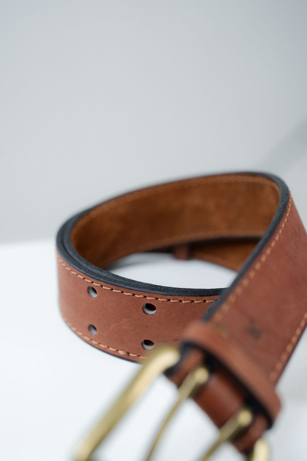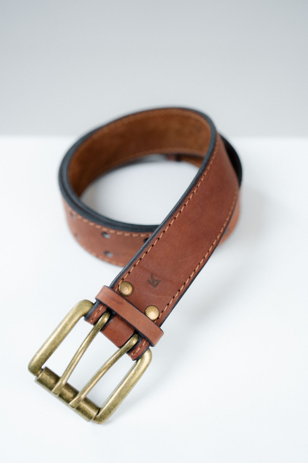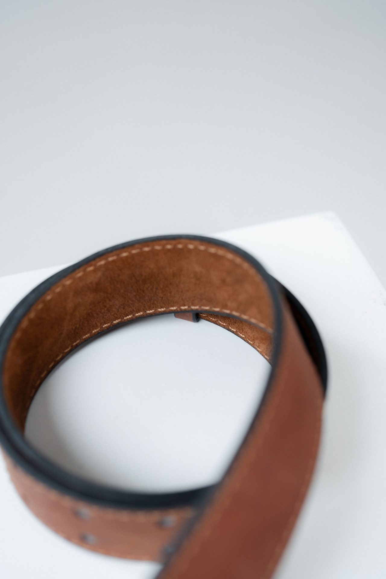 Rivets de maintien en métal magnétique, finition dorée patinée, tête lisse légèrement bombée, fixation mécanique dense. Intégration affleurante dans le cuir, sans excès décoratif. Passants en cuir pleine fleur ton sur ton, bords travaillés, perçages nets.
