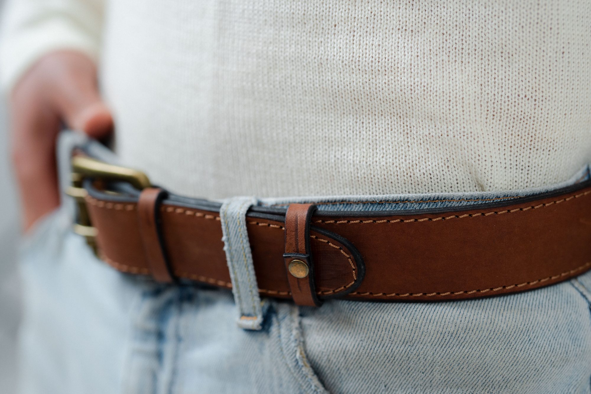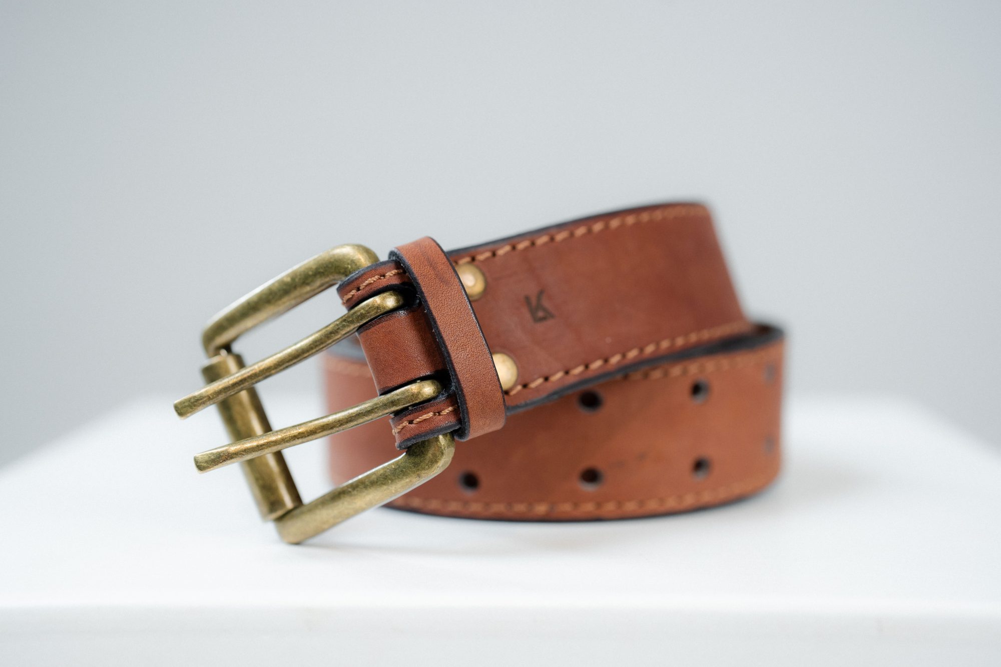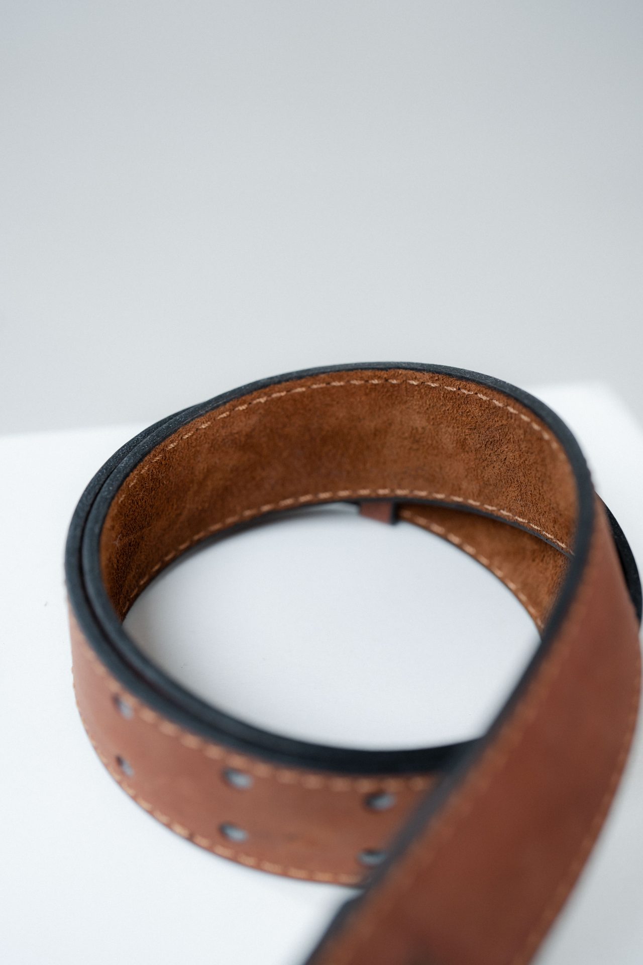 Rivets de maintien en métal magnétique, finition dorée patinée, tête lisse légèrement bombée, fixation mécanique dense. Intégration affleurante dans le cuir, sans excès décoratif. Passants en cuir pleine fleur ton sur ton, bords travaillés, perçages nets.